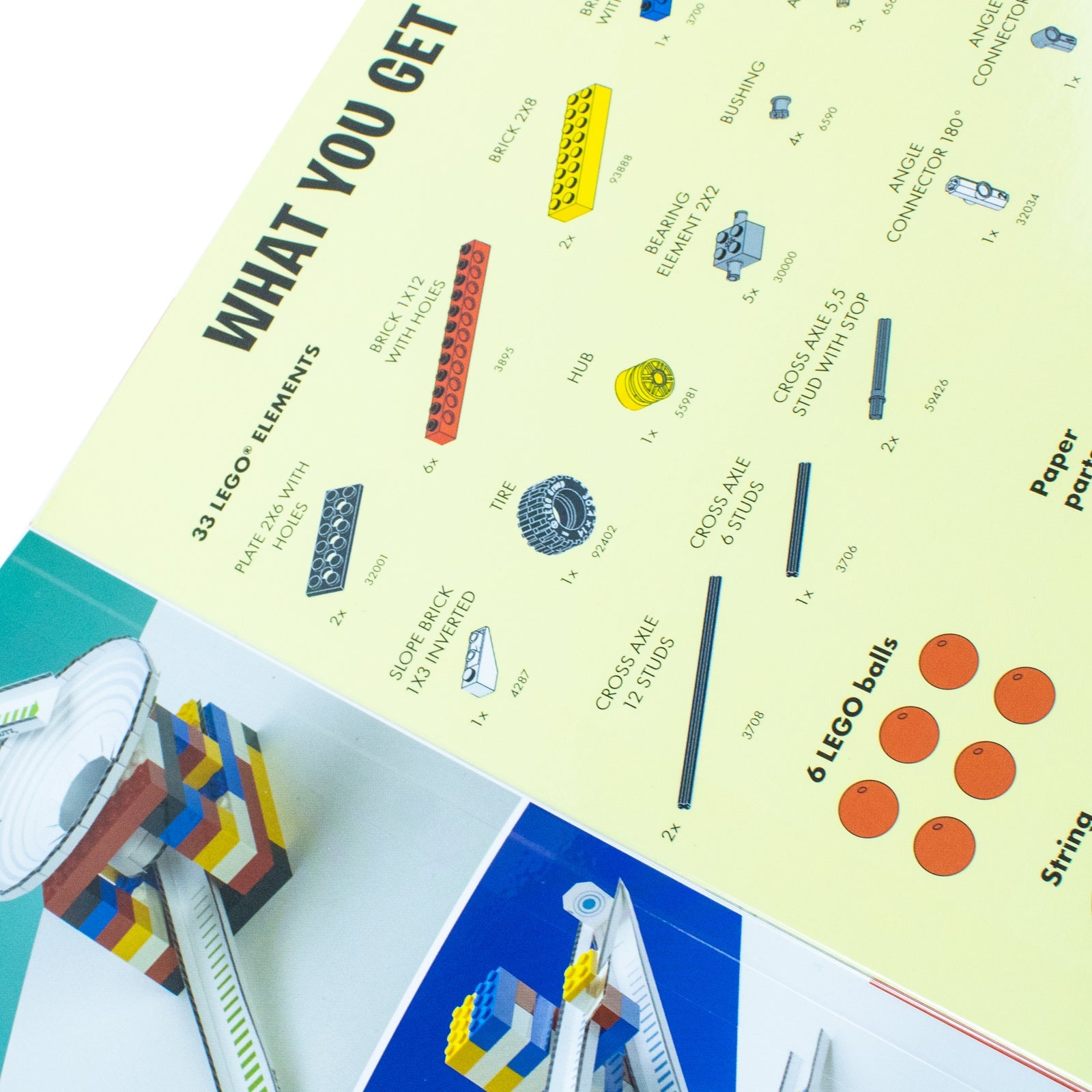 Includes 78-page book of instructions and inspiration, 33 LEGO elements, 6 LEGO balls, 2.2 yards of string, 8 paper ramps, 2 paper pop-up signs, paper funnel, paper flag, paper bucket, platform
