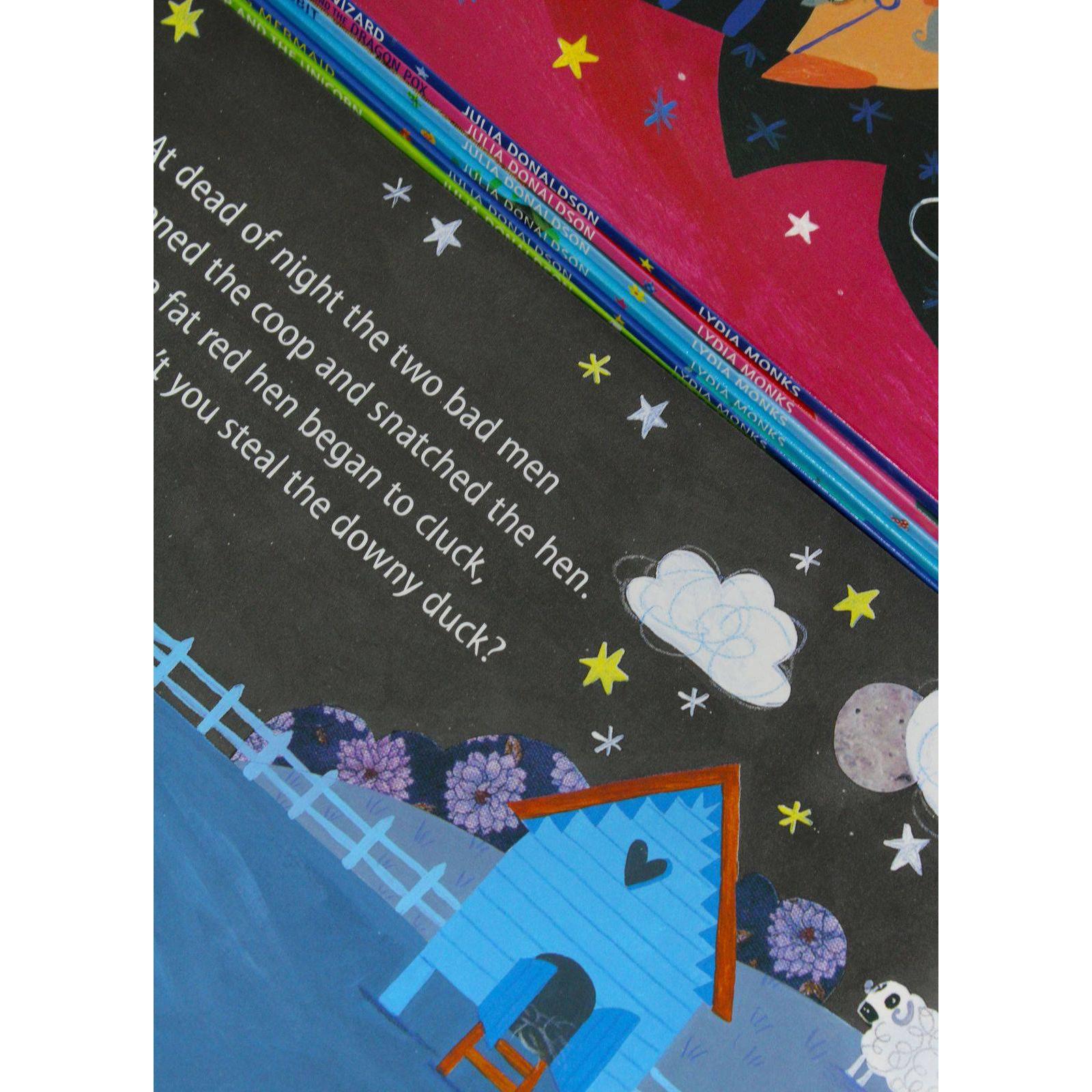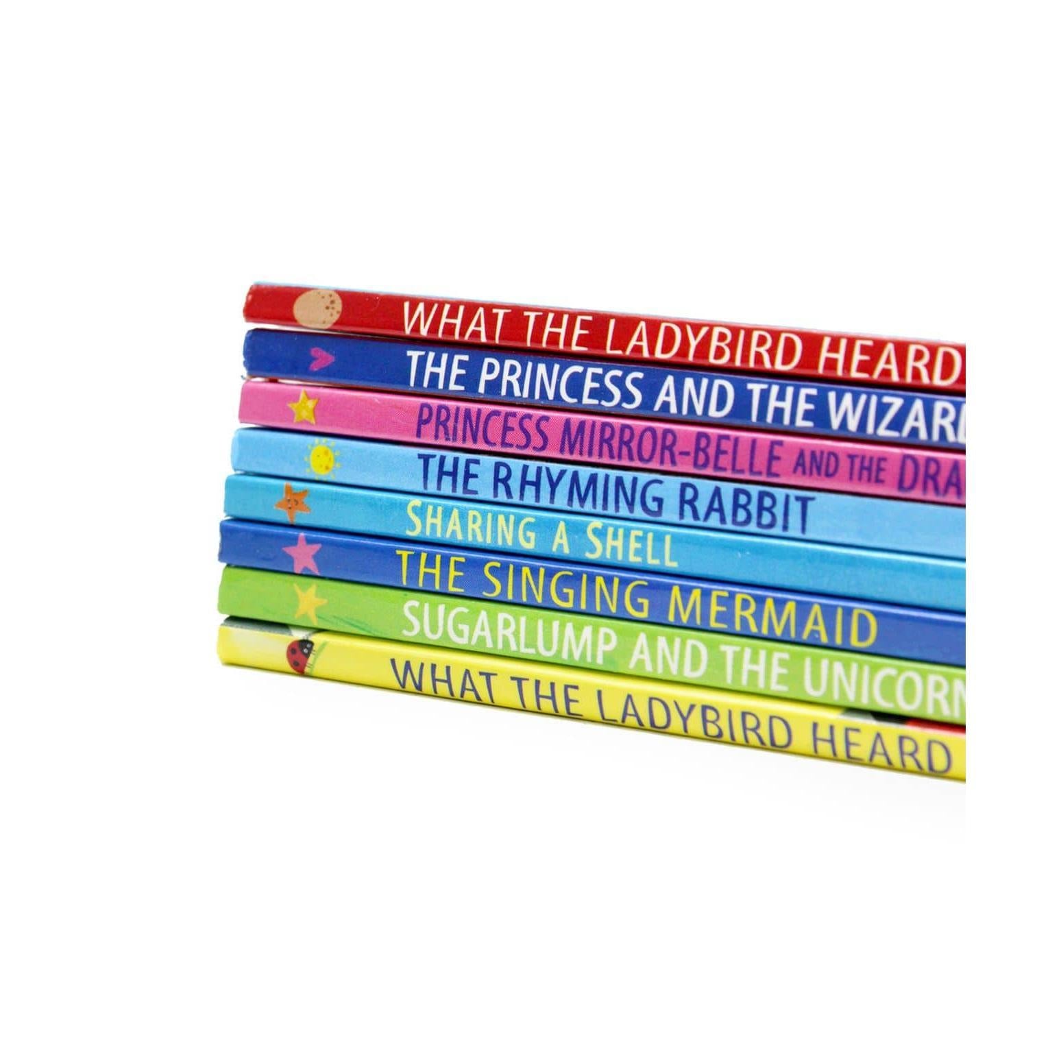 Description What the Ladybird Heard What the Ladybird Heard is a fantastically funny story from the stellar picture book partnership of Julia Donaldson and Lydia Monks. With brilliant rhyming verse, bright distinctive illustrations and glitter on every page, this much-loved modern classic is perfect for reading aloud. What the Ladybird Heard Next Join the cow, the goose, the horse, the sheep, the cat, and everyone's favourite ladybird in this fantastically funny farmyard caper from the stellar picture book partnership of Julia Donaldson and Lydia Monks, creators of What the Ladybird Heard. With slapstick action, animal noises and a mysterious Snuggly Snerd bird, What the Ladybird Heard Next is a story you'll be reading over and over again. Sugarlump and the UnicornWhen Sugarlump the rocking horse longs to see the world, a magical unicorn with a silver horn and sparkling blue eyes grants his wish and turns him into a real horse. But after trotting around the farm, galloping around a racetrack and even dancing at the circus, Sugarlump learns to be careful what he wishes for. Luckily the unicorn has one more wish to grant . . . The Singing mermaid The Singing Mermaid is a delightful tale from the stellar picture book partnership of Julia Donaldson and Lydia Monks, creators of What the Ladybird Heard. With brilliant rhyming verse, bright and distinctive illustrations and glitter on every page, this story is loved by children and parents alike. Princess Mirror-Belle and the Dragon Pox Princess Mirror-Belle and the Dragon Pox is a magical story from the stellar picture book partnership of Julia Donaldson and Lydia Monks, creators of What the Ladybird Heard. A fun story about an unexpected friendship, paired with bright and distinctive illustrations and glitter on every page, this story is perfect for reading together. Sharing a Shell Sharing a Shell is a charming underwater tale of friendship and fun from the stellar picture book partnership of Julia Donaldson and Lydia Monks, creators of What the Ladybird Heard. With brilliant rhythmic verse, bright and distinctive illustrations and glitter on every page, this is a firm favourite with children and parents alike. The Rhyming Rabbit The Rhyming Rabbit is a clever rhyming adventure from the stellar picture book partnership of Julia Donaldson and Lydia Monks, creators of What the Ladybird Heard. With brilliant rhyming verse, bright and distinctive illustrations and glitter on every page, this story is a delight to read aloud. The Princess and the WizardThe Princess and the Wizard is a magical adventure from the stellar picture book partnership of Julia Donaldson and Lydia Monks, creators of What the Ladybird Heard. With brilliant rhyming verse, bright and distinctive illustrations and glitter on every page, this story is perfect for reading together.Product specifications